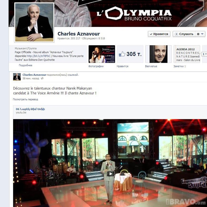 Նարեկ Մակարյանի ելույթի տեսագրությունը տեղադրվել է Շառլ Ազնավուրի "ֆեյսբուքյան" էջում