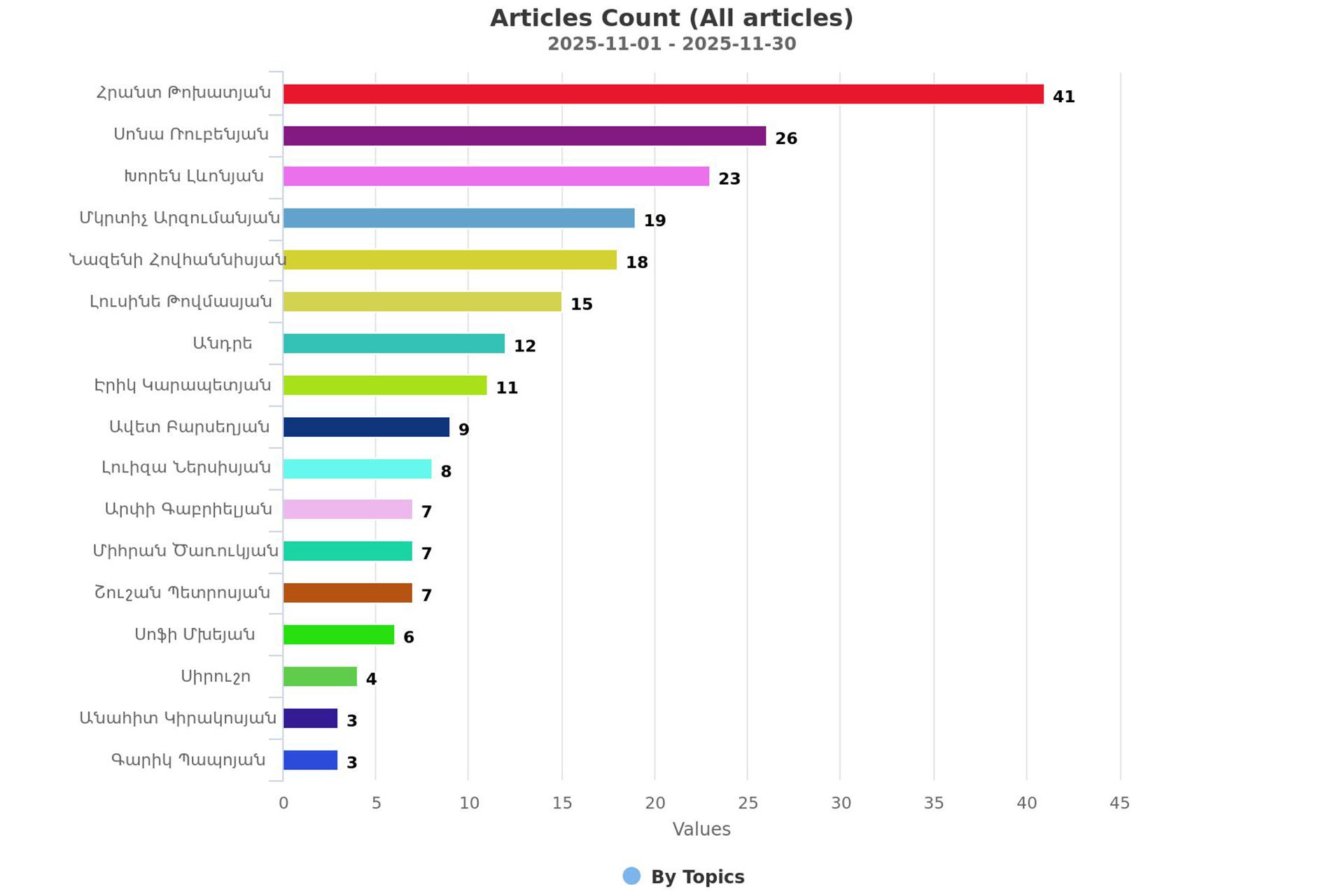 Նոյեմբերին հայկական մեդիայում հիշատակումների թվով առաջատարը Հրանտ Թոխատյանն է: Հայաստանի վաստակավոր արտիստի վերադարձը բեմ տեւական դադարից հետո լայն լուսաբանում ստացավ լրատվամիջոցներում, ինչին հաջորդեցին նրա հարցազրույցները: